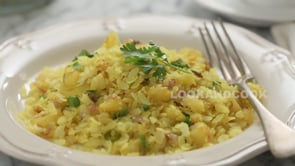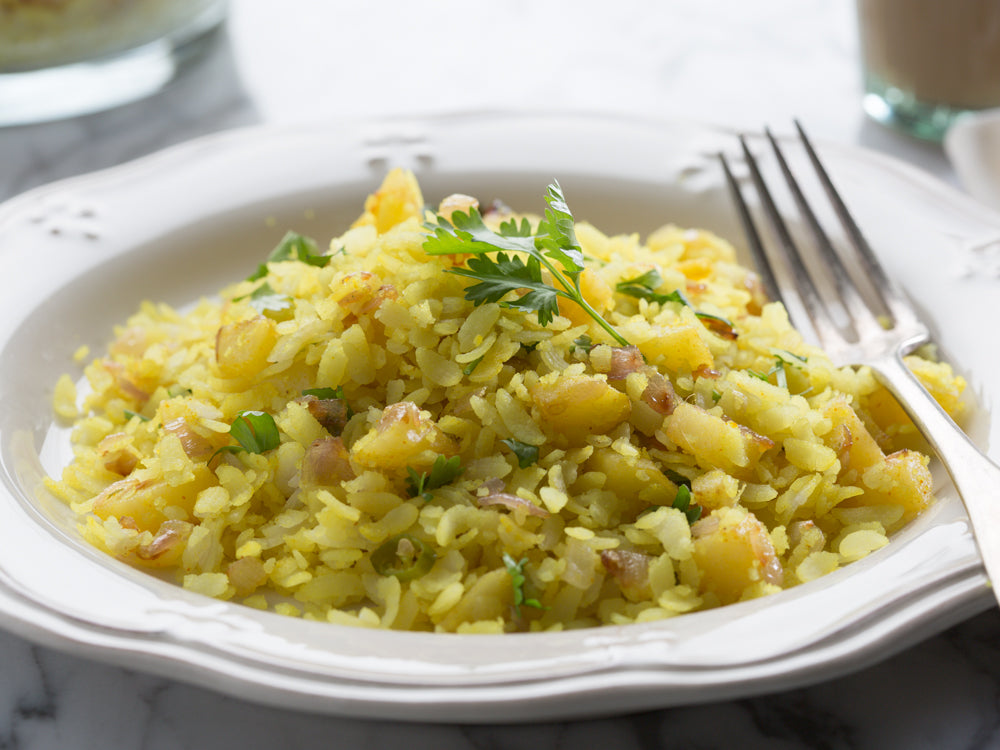 Potato Pohe: A delightful Indian breakfast dish made with flattened rice (poha), sautéed potatoes, and a medley of spices, creating a flavorful and satisfying combination of textures and flavors.