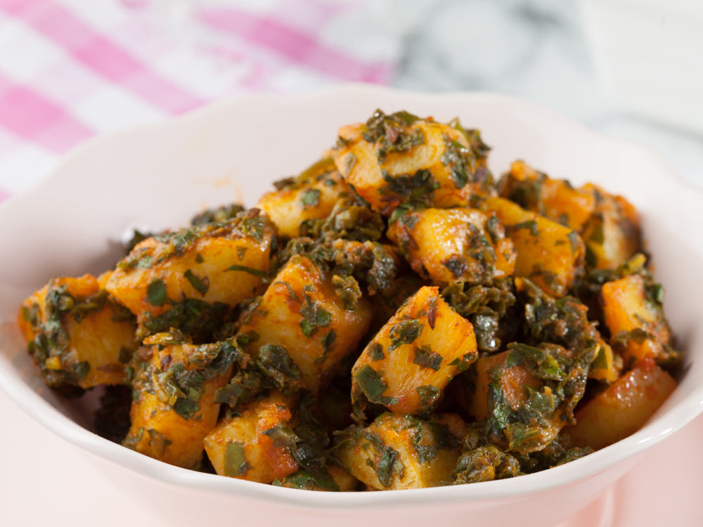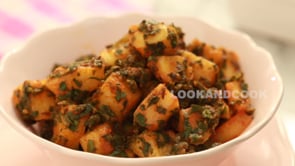 Potato with Spinach: A flavorful dish combining tender potatoes and nutritious spinach, cooked in aromatic spices and herbs. A wholesome and satisfying vegetarian option bursting with taste and goodness.