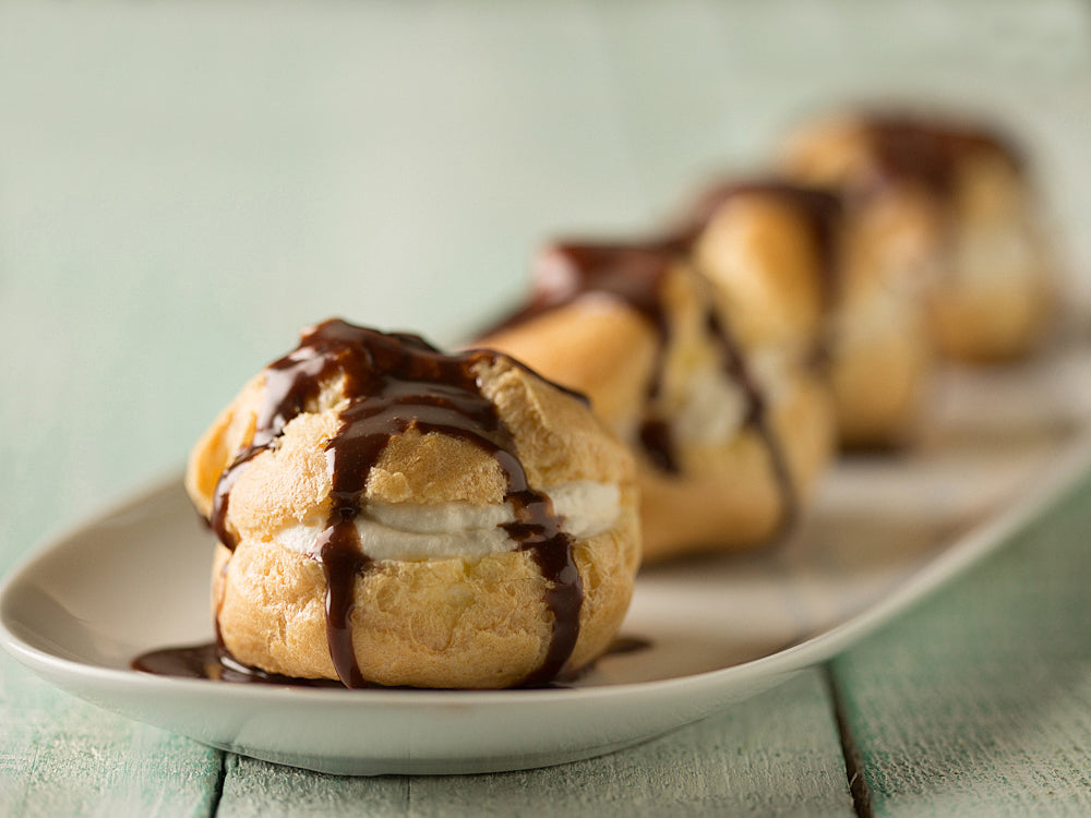 Profiteroles: Light and airy choux pastry puffs filled with decadent vanilla custard or whipped cream and drizzled with rich chocolate sauce. These delightful French pastries are a sweet and elegant treat for any occasion.